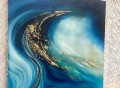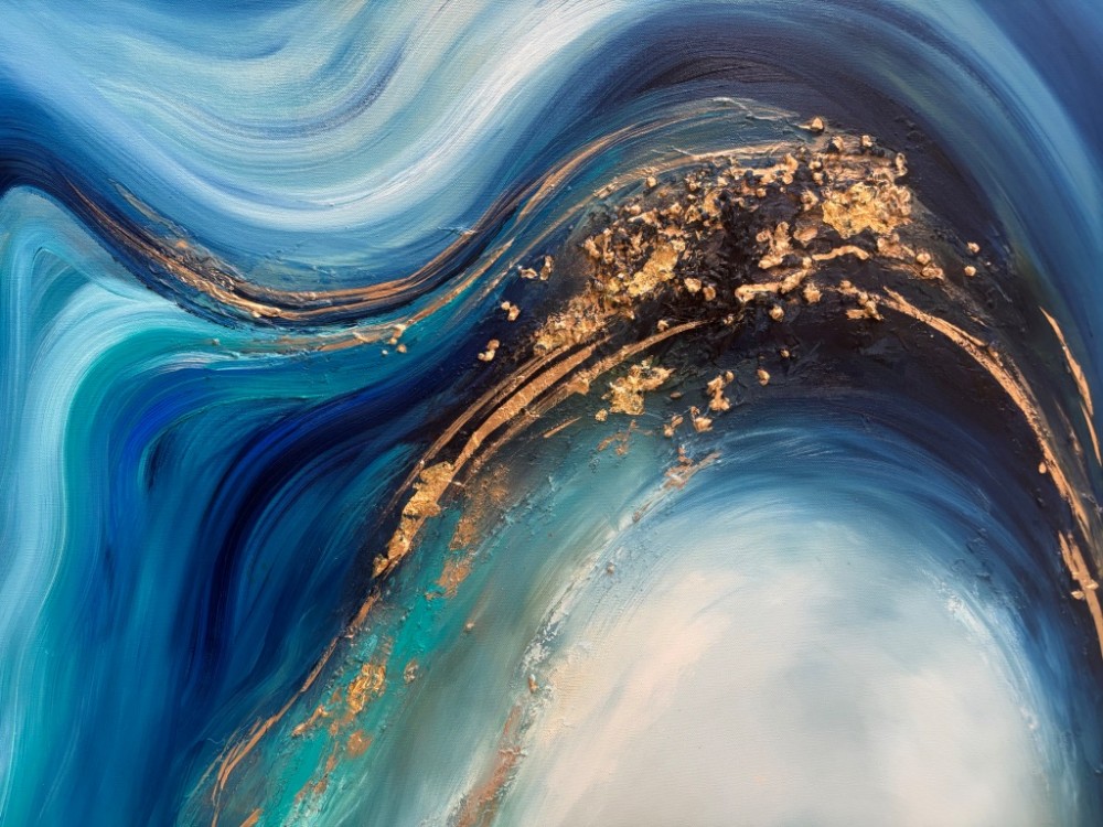 In this piece, I swirled oil and plaster to capture the dynamic essence of movement. The spiraling blues and turbulent strokes express a deep emotional release, like an unstoppable wave freeing itself. Accents of golden leaf infuse the composition with bursts of light and energy, symbolizing hope and resurgence. This artwork brings a powerful and uplifting energy to any space, inviting viewers to dive into their own depths and emerge renewed.