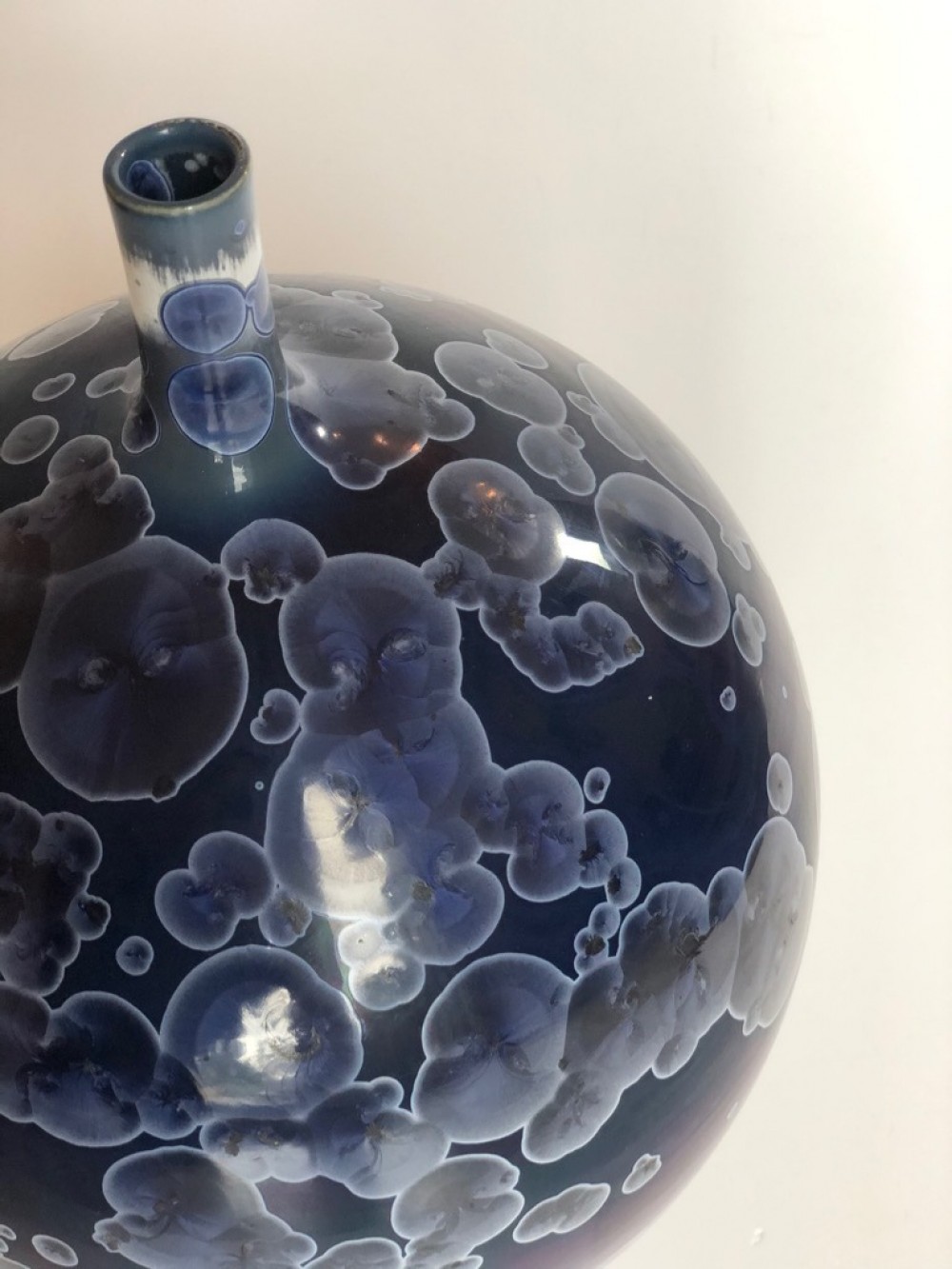 Medium Detail: Porcelain, wheel thrown bottle. High fired crystalline glaze and then etched to highlight the crystal formation. Cobalt blue.